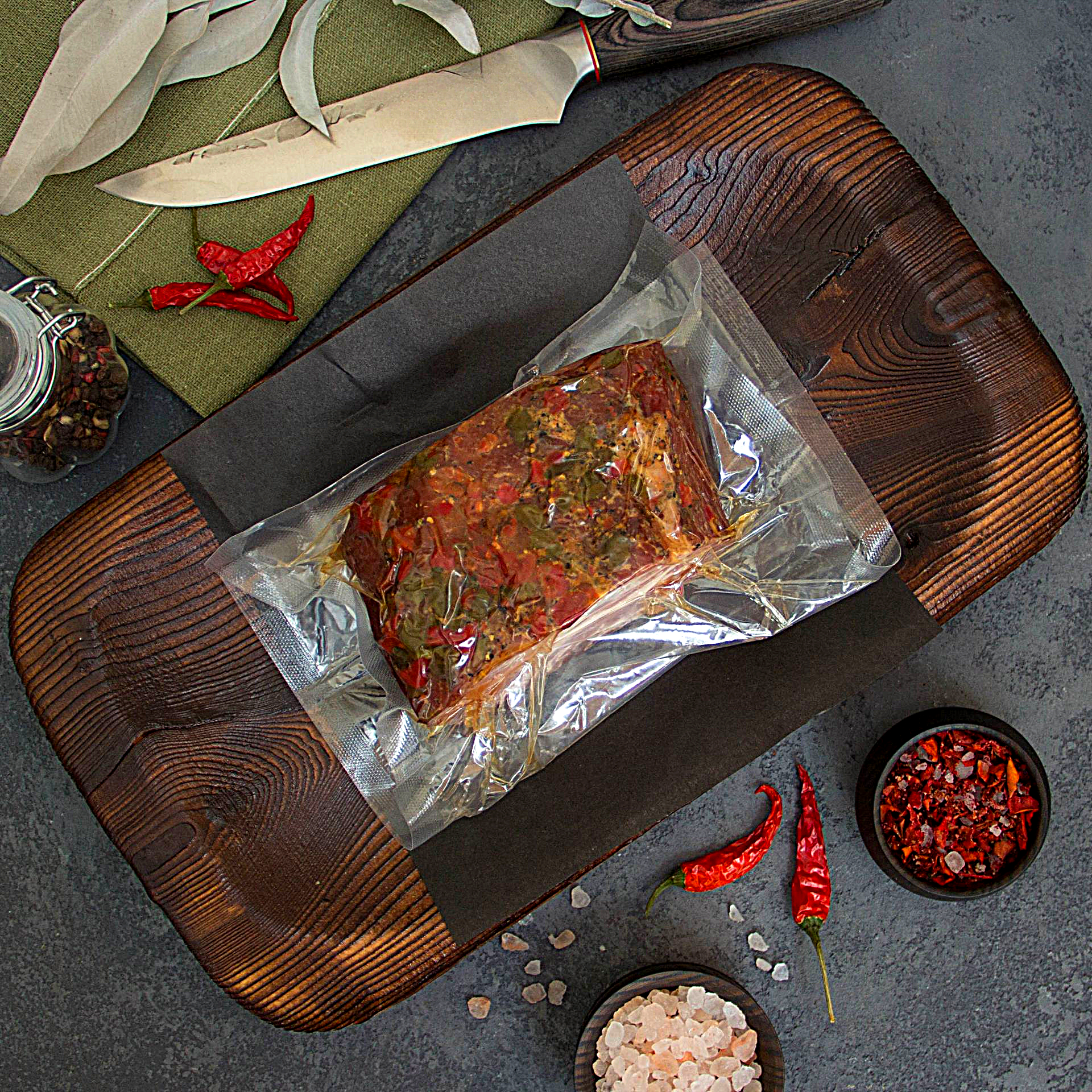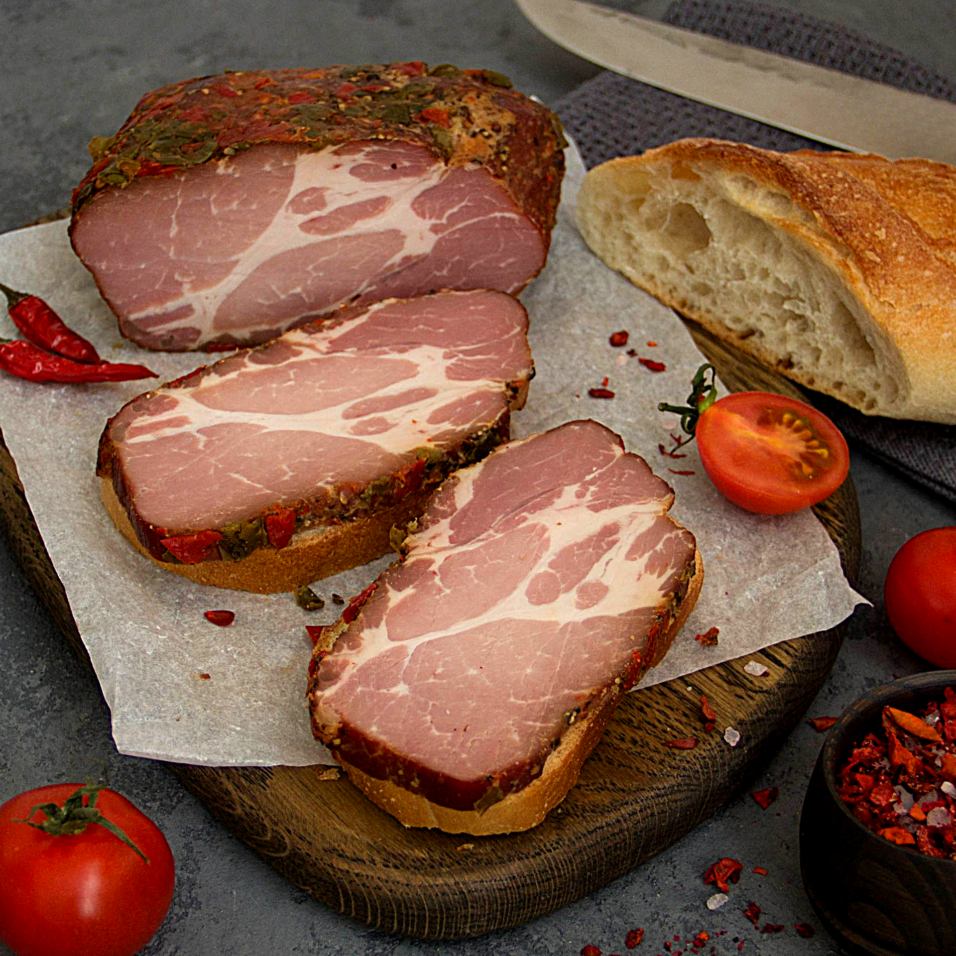 Шея свиная «Домашняя» горячего копчения — это сочный и насыщенный деликатес, приготовленный по традиционной технологии с особым вниманием к вкусу и текстуре. В основе — отборный отруб свиной шеи, известный своей мраморностью и мягкостью. Мясо предварительно маринуется в смеси поваренной и нитритной соли с добавлением чёрного перца, сушёного базилика и лаврового листа, благодаря чему приобретает выразительный аромат и глубокий вкус.