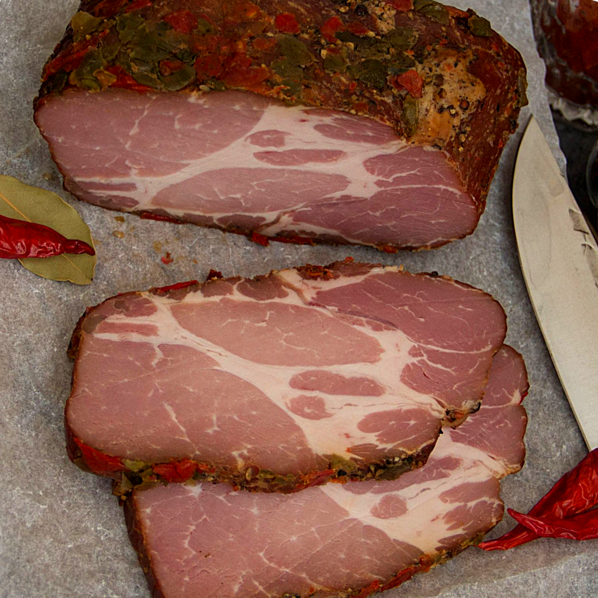 Горячее копчение придаёт шее аппетитную золотистую корочку и насыщенный дымный аромат. Внутри мясо остаётся нежным, сочным и мягким, а тонкие прожилки жира делают вкус особенно богатым и гармоничным. При нарезке открывается красивая структура мяса с естественным блеском и насыщенным оттенком, который говорит о правильной технологии приготовления.
