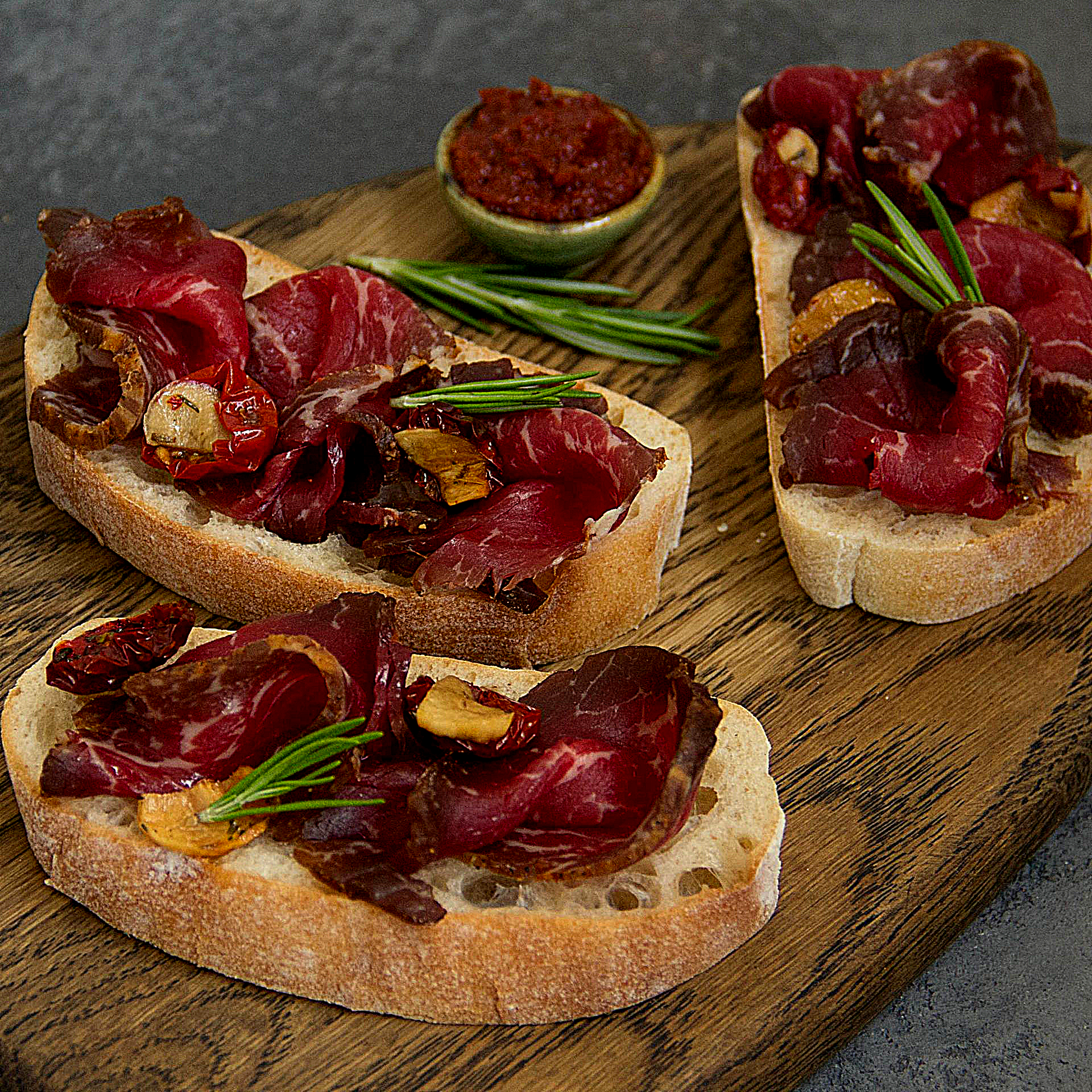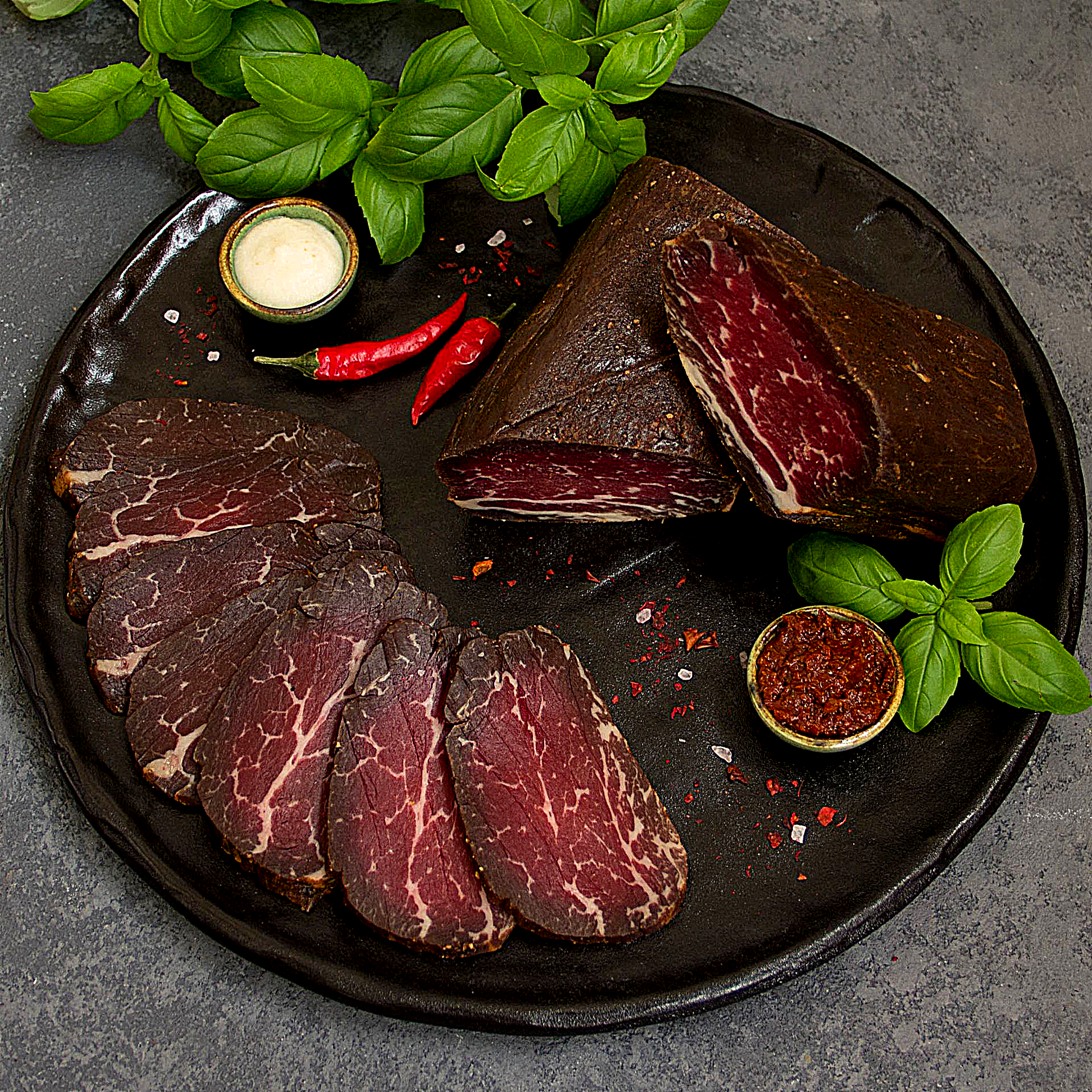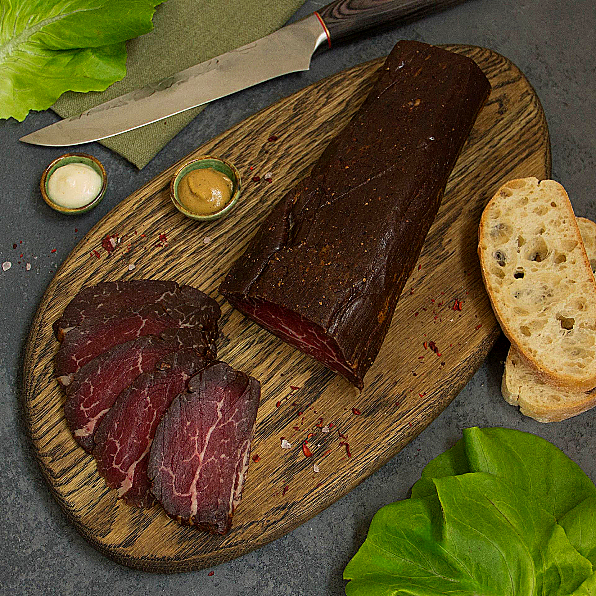 Каждый кусок вырезки — это результат терпения и мастерства. Мясо постепенно теряет влагу, концентрируя вкус и формируя тонкую текстуру, которая буквально тает во рту. Аромат сбалансирован и чист — без излишней солёности, с едва уловимыми перчёными и древесными нотами. При нарезке вырезка демонстрирует ровный рубиново-красный цвет с тонкой мраморностью, характерной для правильно выдержанного мяса.