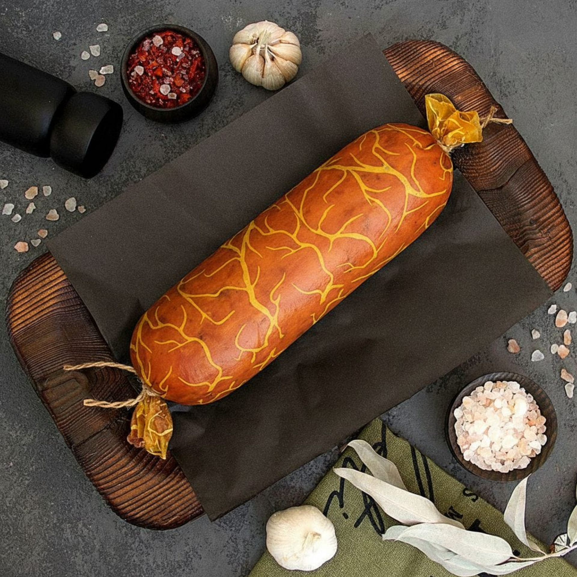 В рецептуре используются натуральные специи: кориандр, имбирь, белый и чёрный перец, мускатный орех — они придают продукту деликатный аромат и лёгкую пряность, не перебивая естественный вкус мяса. Благодаря аккуратной обработке и добавлению функциональных компонентов, ветчина получается упругой, хорошо держит форму и легко нарезается тонкими ломтиками.