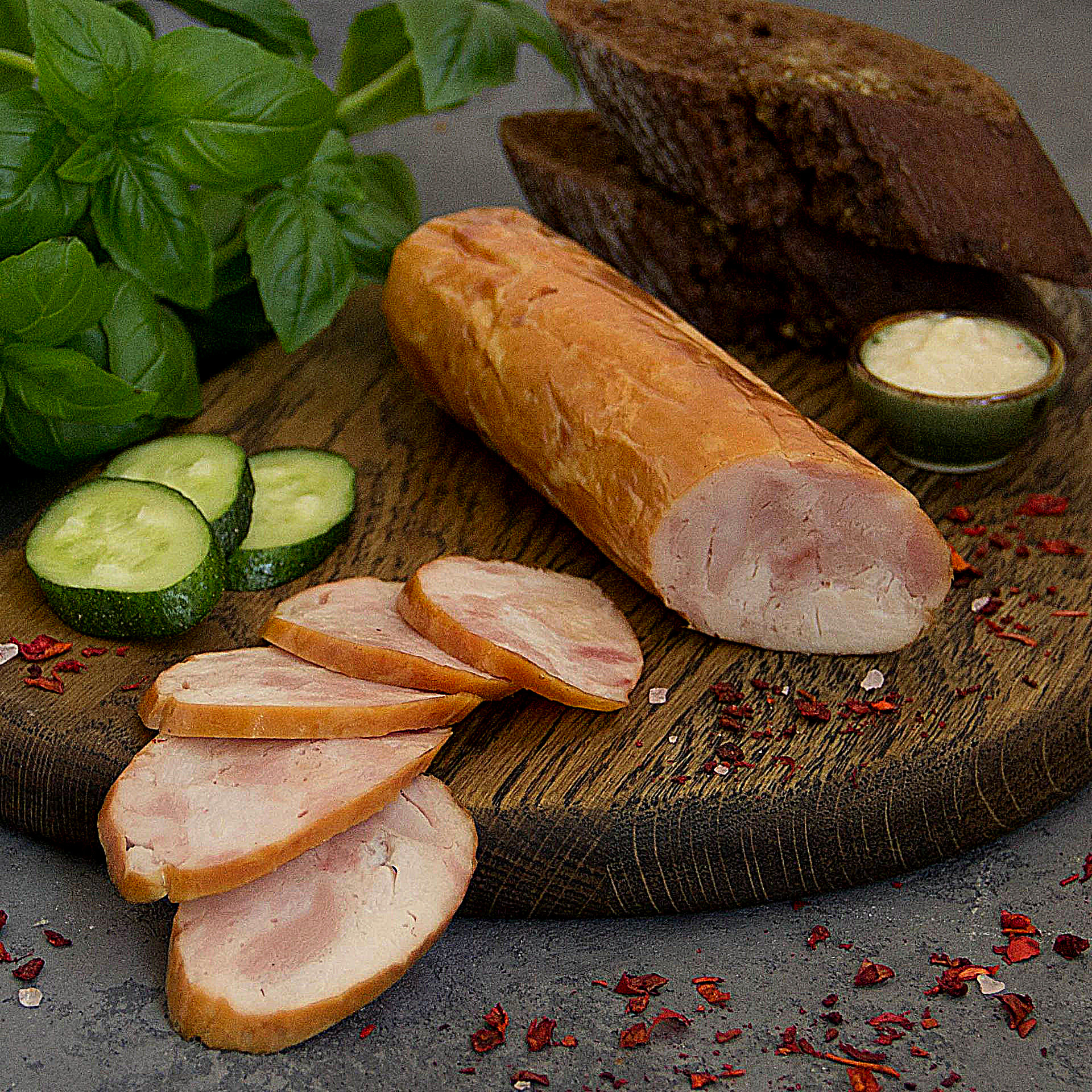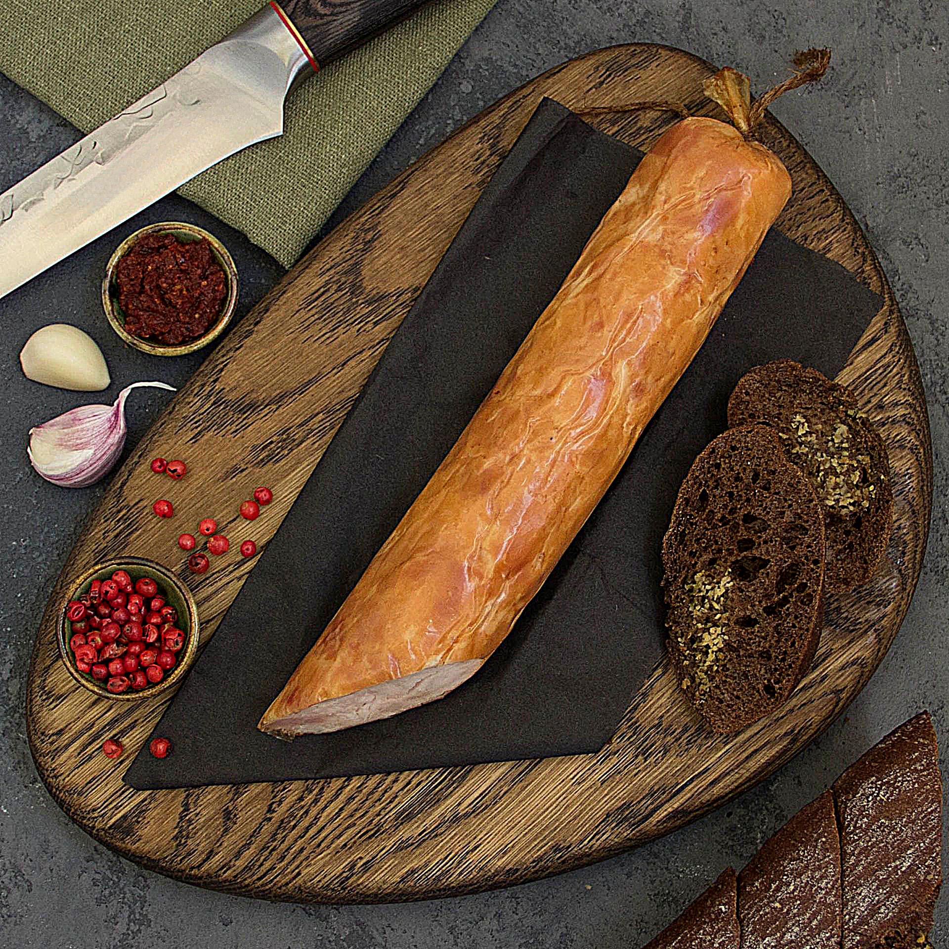 Эта колбаса универсальна — она одинаково хорошо чувствует себя в нарезке на праздничном столе, в составе завтрака с омлетом или как основа для сэндвича с цельнозерновым хлебом и свежими овощами. Благодаря натуральным ингредиентам и аккуратному копчению, вкус получается чистым, домашним и по-настоящему сбалансированным.