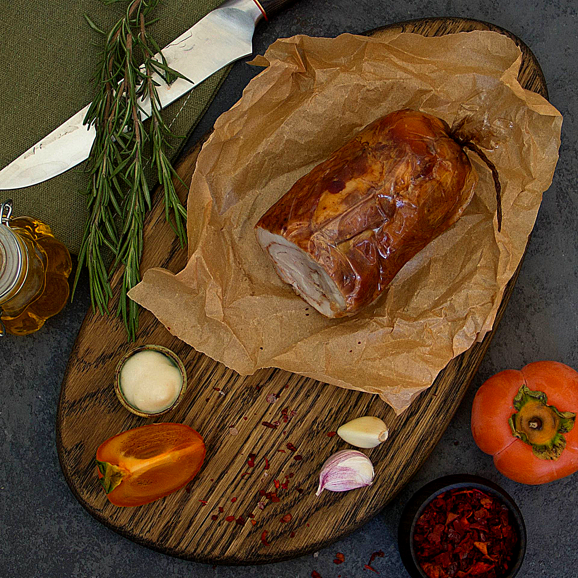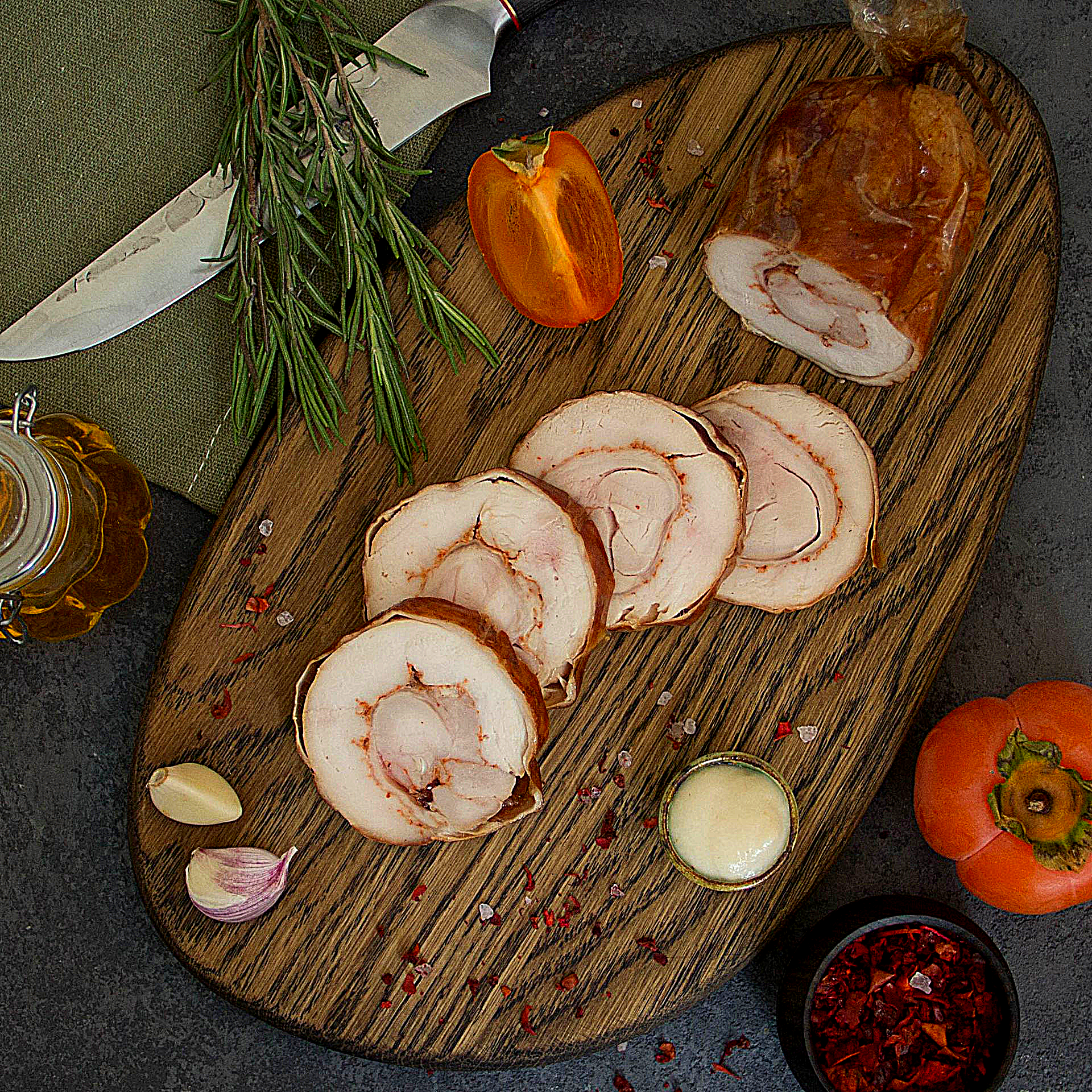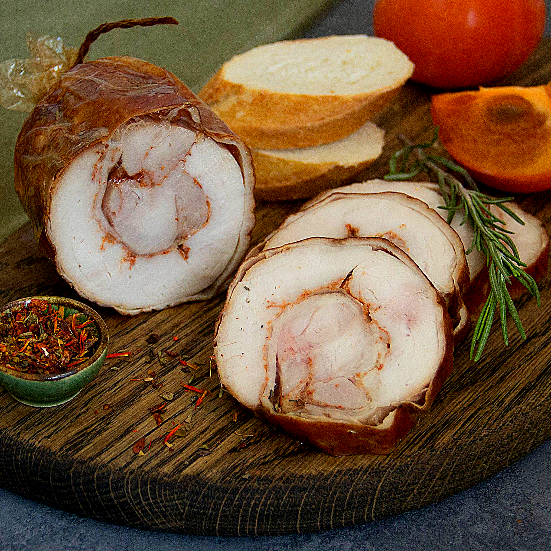 Куриное мясо маринуется с чесноком, чёрным перцем и солью, затем аккуратно сворачивается в плотный рулет и томится до полной сочности. Благодаря такой технологии мясо остаётся мягким и ароматным, а начинка равномерно пропитывает внутренние слои. На срезе рулет выглядит особенно нарядно: контраст белого мяса, янтарной кураги, тёмного чернослива и ореховой россыпи делает его украшением любого стола.