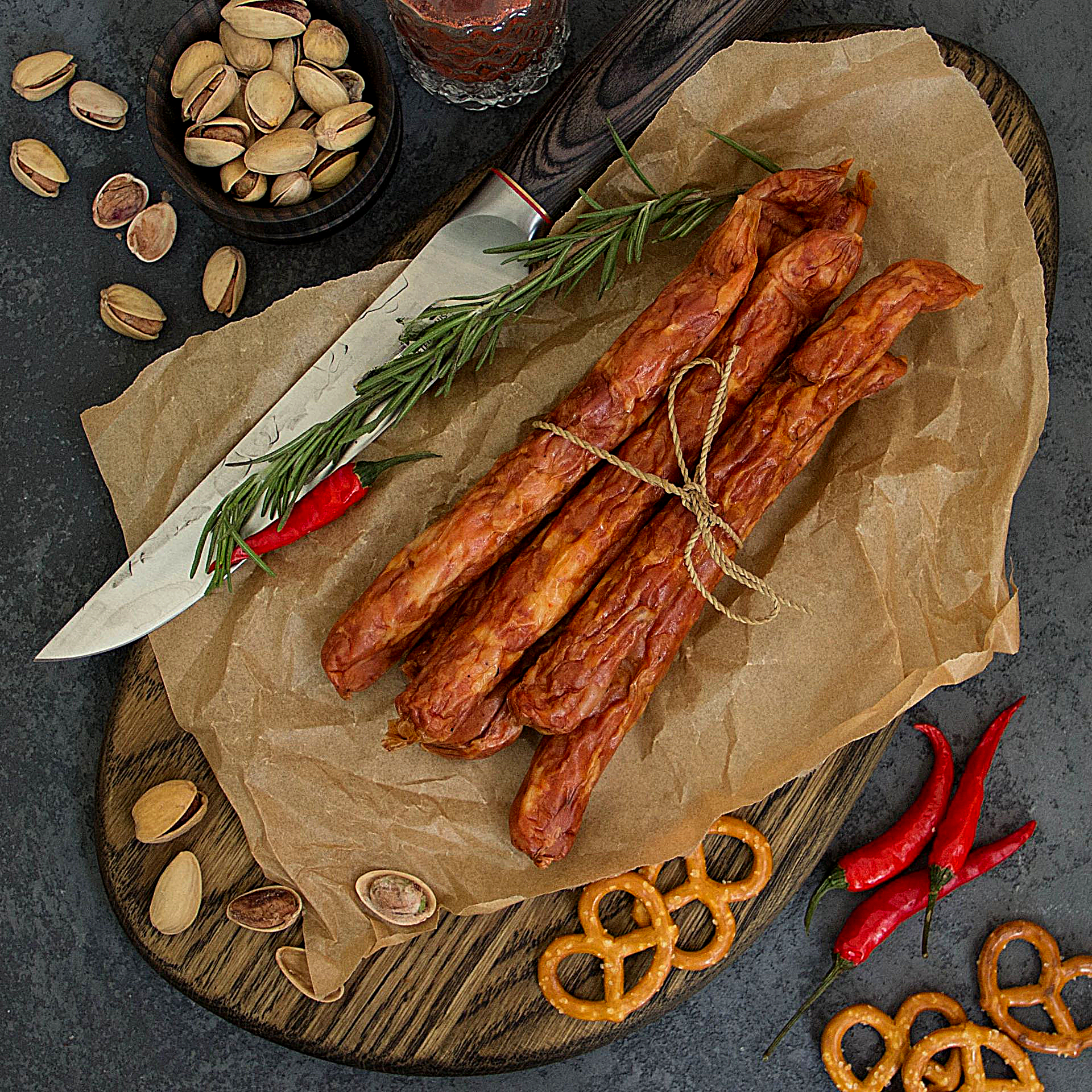 «Пеперони» — это не просто закуска, а универсальный ингредиент, который одинаково хорош и к пиву, и в любимых горячих блюдах. Они отлично подходят для сковороды, гриля, пасты, пиццы и жарких закусок. Это колбаски, в которых каждая специя играет свою роль, а общее звучание — яркое, насыщенное и запоминающееся. Их вкус — это смесь мясной насыщенности, пряной теплоты и лёгкой дымной сладости паприки.