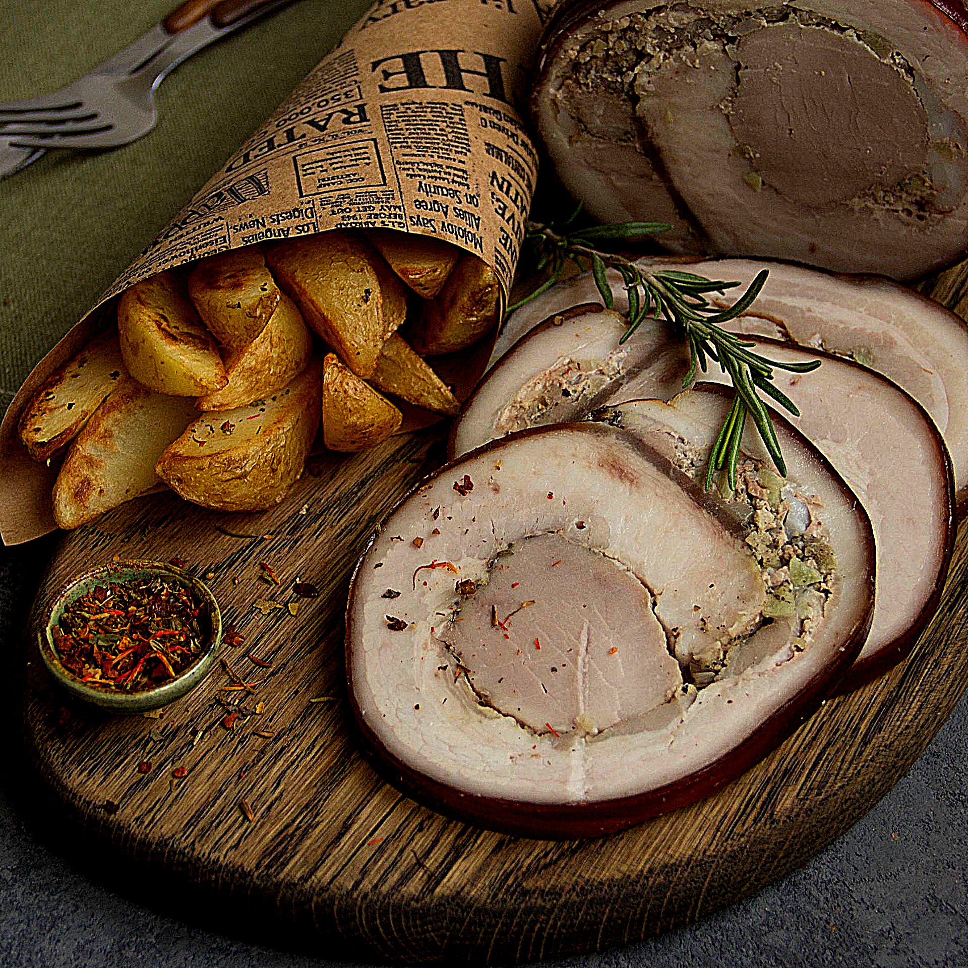 Свиной рулет «Поркетта» — запечённая брюшина с нежной вырезкой, чесноком, лимоном и травами. Хрустящая корочка и богатый аромат.