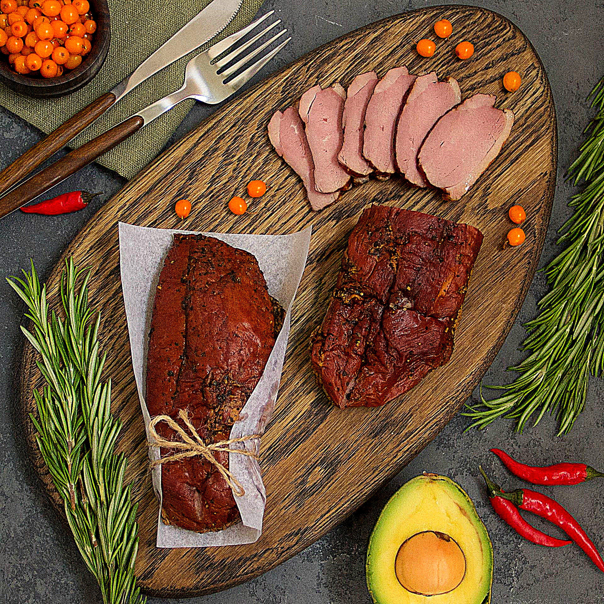 «Утиные грудки» горячего копчения — это не просто мясная закуска, а настоящий гастрономический акцент любого стола. Они идеально подходят для подачи в виде холодной нарезки, как самостоятельное блюдо или как основа для салатов, брускетт и тёплых закусок. Их вкус раскрывается особенно ярко в паре с лёгкими винами или цитрусовыми настойками. Это продукт для тех, кто выбирает качество, утончённость и атмосферу высокой кухни.