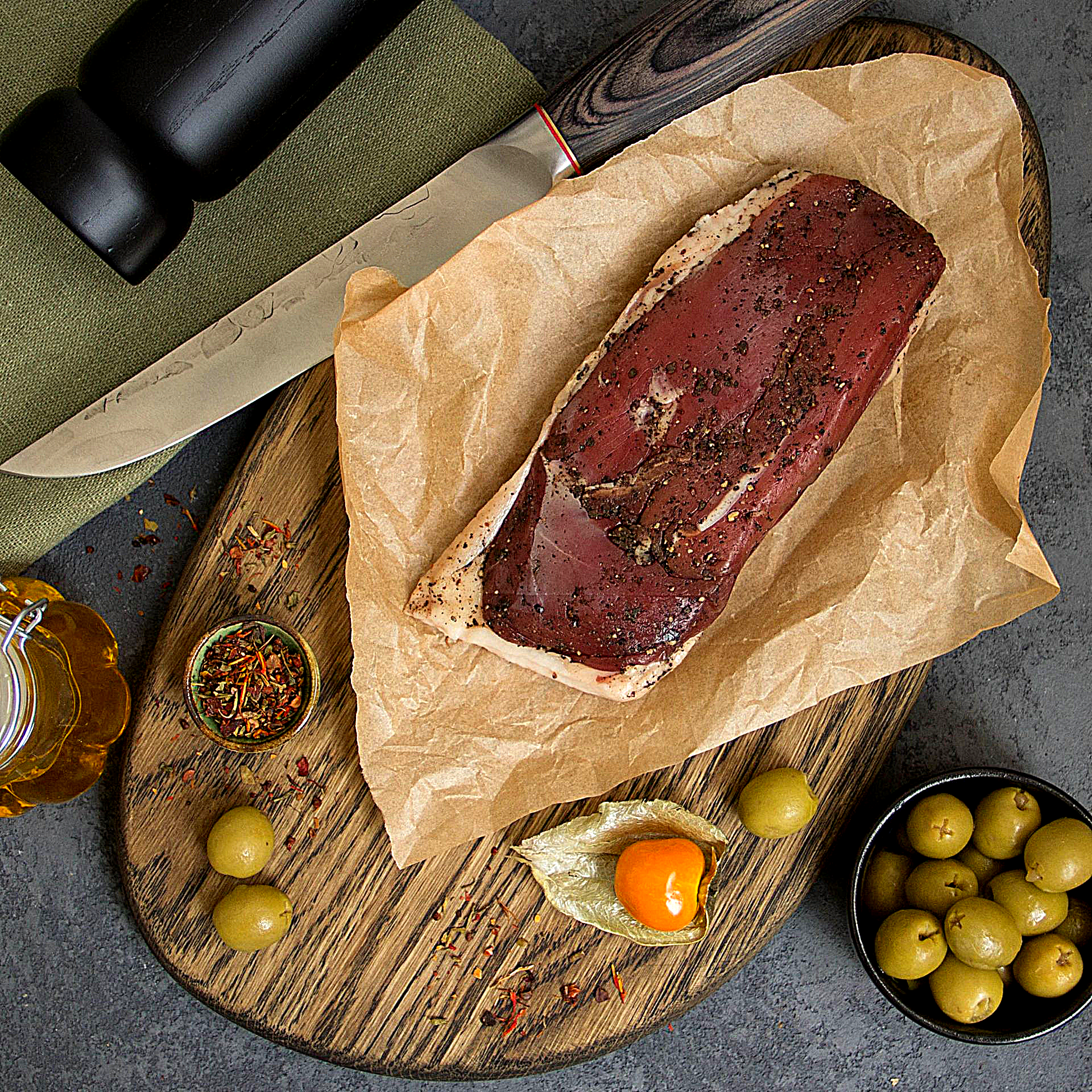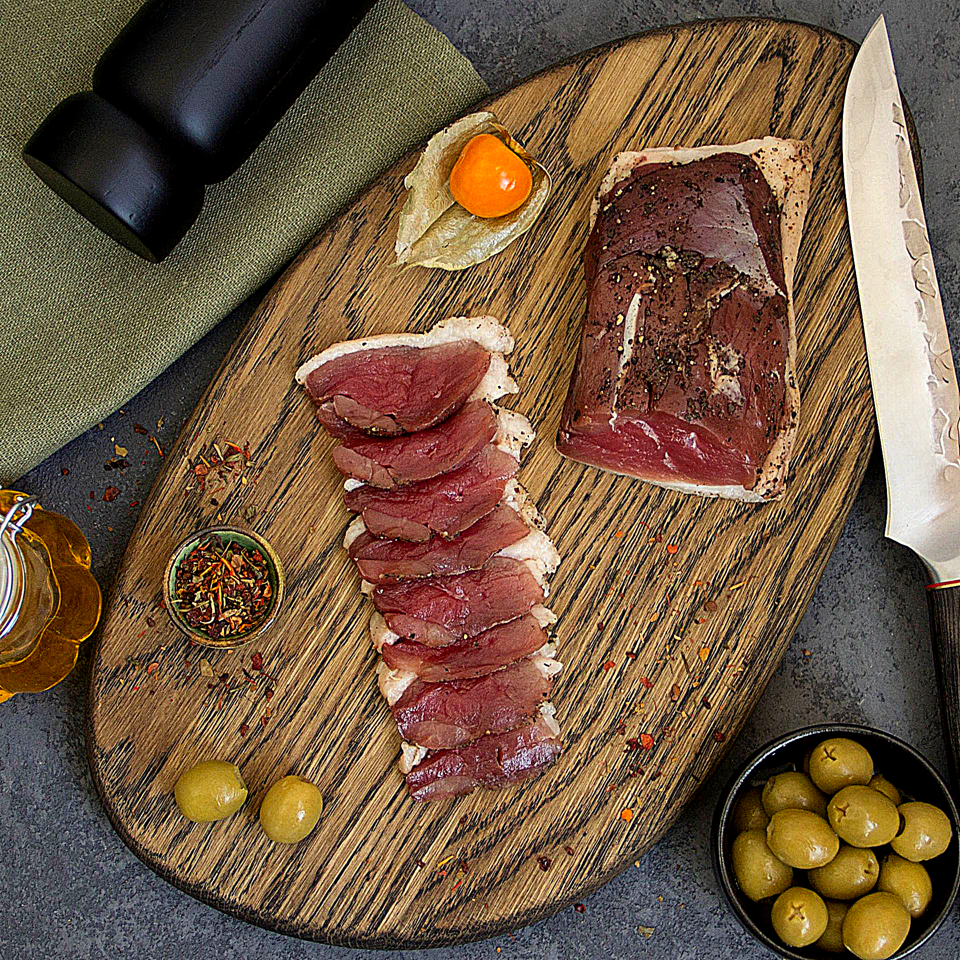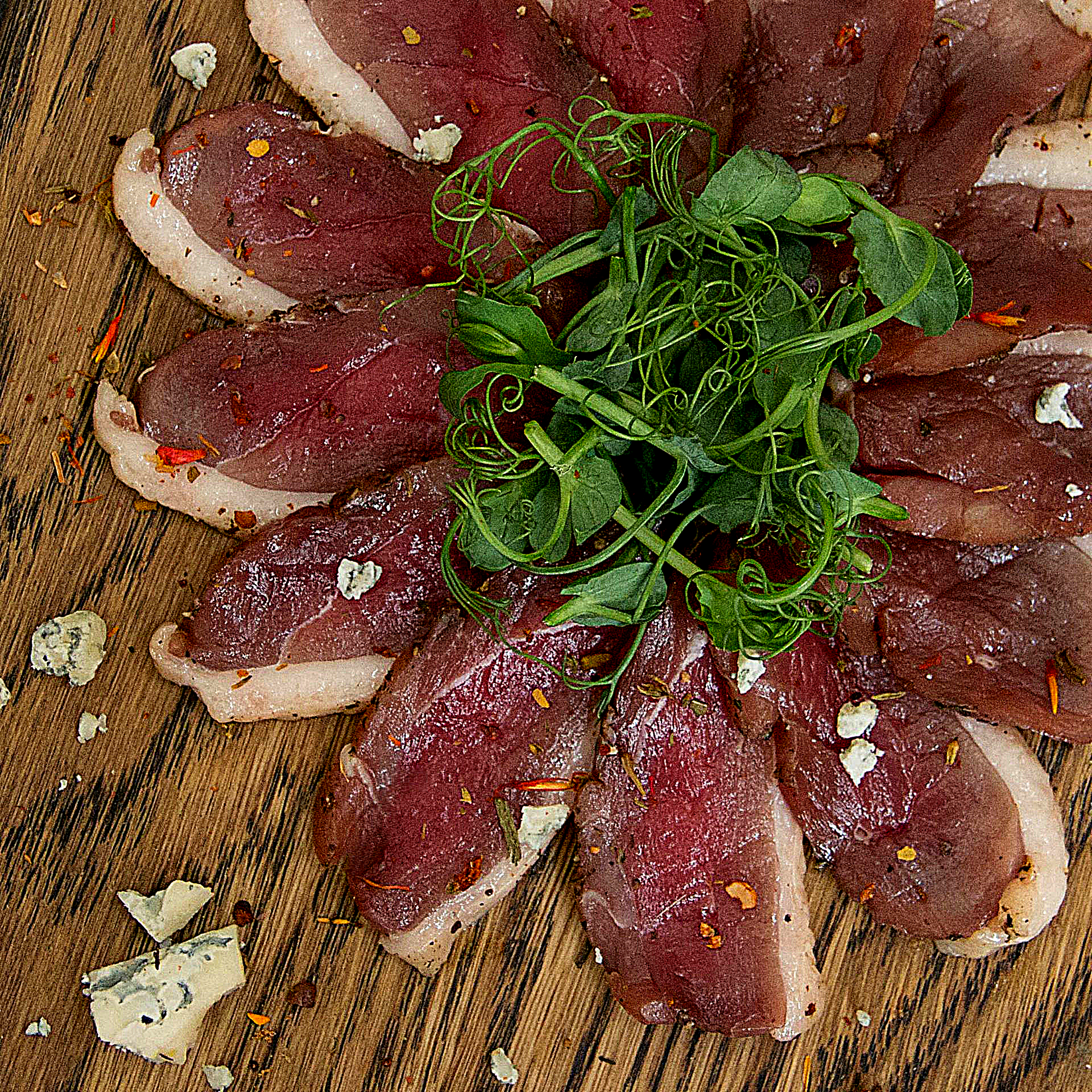 Это идеальный продукт для сервировки фуршетных блюд, салатов, брускетт или мясных тарелок. Тонкие ломтики «Карпаччо» можно подавать с микрозеленью, сливочными соусами, фруктами или мягкими сырами — сочетание солёно-древесного вкуса утки и нежной сладости гарнира создаёт гастрономическую гармонию. Каждый кусочек — это вкус, баланс и эстетика.